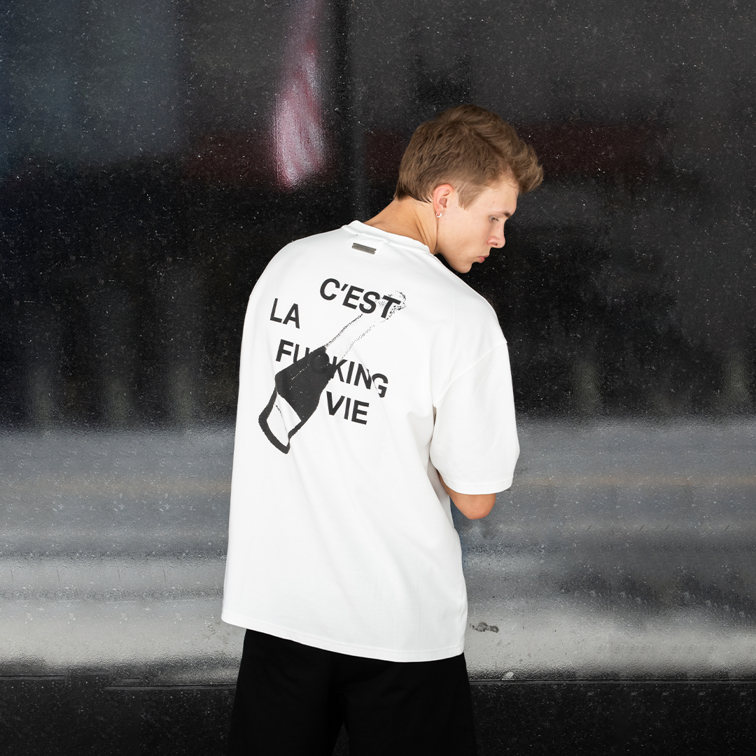 We proudly present the C'EST LA FUCKING VIE OVERSIZED T-SHIRT – the perfect balance of comfort and style. Made of 100% cotton with a full cut and dropped shoulder design, this crew neck T-shirt features original artwork on the front and back, making it a unique and fashionable addition to your wardrobe.