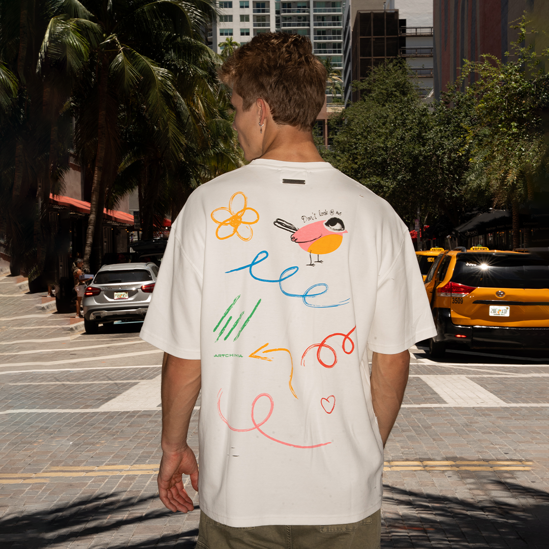 We proud present the DON'T LOOK @ ME OVERSIZED T-SHIRT – the perfect balance of comfort and style. Made of 100% cotton with a full cut and dropped shoulder design, this crew neck T-shirt features original artwork on the front and back, making it a unique and fashionable addition to your wardrobe.